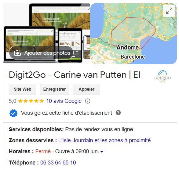 Vous savez maintenant comment référencer et gérer votre fiche Google Business Profile. Mais pour être visible sur Google il ne faut pas oublier d’être présent sur internet par d’autres moyens. L’un étant votre site internet qui devra corroborer en tout point de vue vos informations sur votre fiche. Si vous utilisez un CMS comme WordPress, pensez à afficher vos avis Google avec un plugin comme Google Reviews ou Trustindex. Mettez votre adresse et votre numéro de téléphone dans le footer et renseignez également vos horaires d’ouverture.