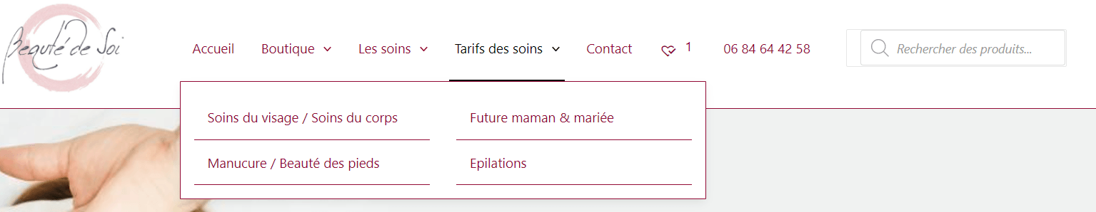 Comme dans le cas de la plupart des sites Web, vous n’avez besoin de répertorier que les pages les plus importantes. Prévoyez un menu déroulant pour plusieurs pages d’une même catégorie. Les menus déroulants « boutique » (avec les catégories des produits en sous-menu) » les soins » ou « tarifs des soins » de l’image ci-dessous sont un exemple de cette conception simple :